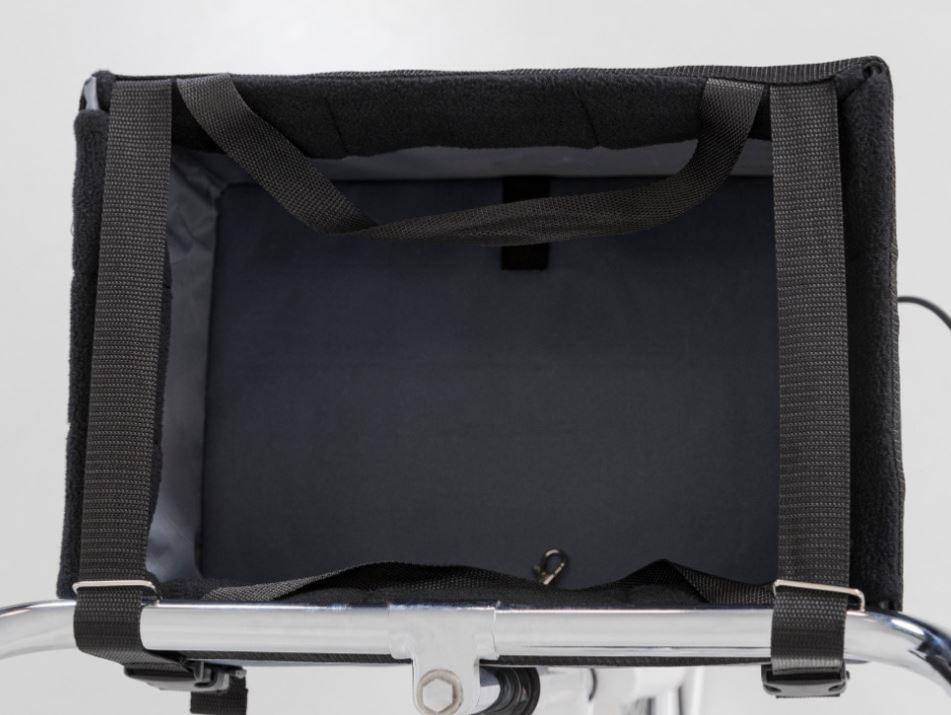 Panier de transport à fixer sur le guidon du vélo, facile à mettre en place, avec ses sangles réglables, équipé d'une sangle à fixer sur le collier ou le harnais du chien empêchant celui-ci de sauter du panier de transport.