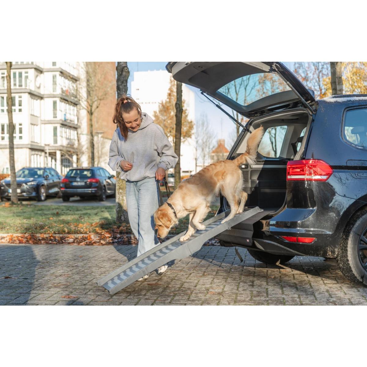 Votre chien à des difficultés pour monter dans le coffre de votre véhicule, utilisez la rampe d'accès pliante, elle vous permettra de ne pas avoir besoin de le porter et le protégera des sauts douloureux pour lui. S'adapte à tout type de véhicule.