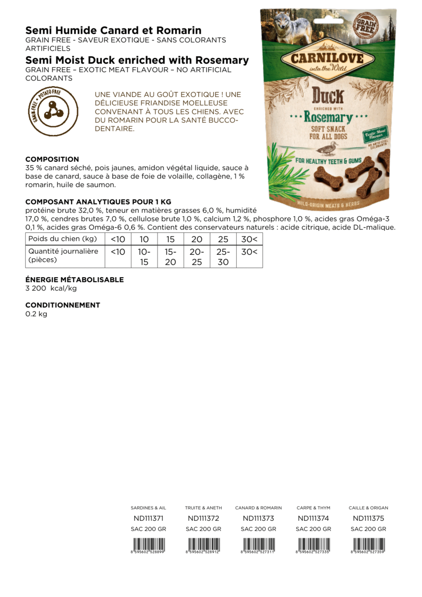 Friandises semi-humides super premium pour tous chiens, les snacks Carnilove composés de 35% de canard, enrichie de romarin pour une bonne santé bucco dentaire. Les friandises sont données en complément de l'alimentation habituelle.